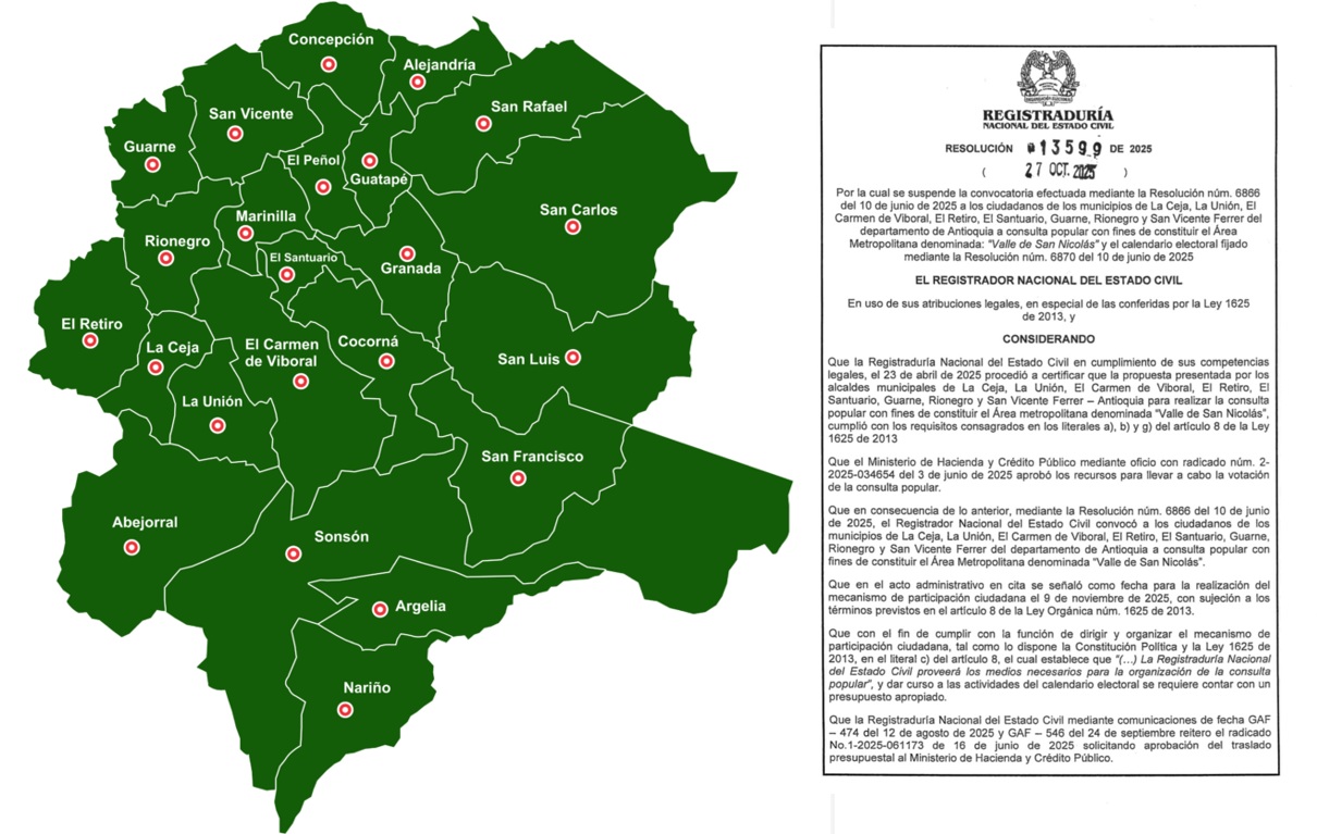 La Registraduría Nacional del Estado Civil anunció la suspensión de la consulta popular mediante la cual se buscaba conformar el área metropolitana “Valle de San Nicolás”, en el departamento de Antioquia.