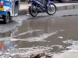 Vecinos tapan con arena un hueco que genera caos en la calle 30